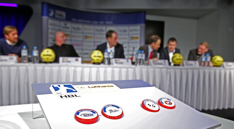 DHB-Pokal-Final-Four-Auslosung: Martin Schwalb (HSV), Uwe Kölling (Lübbecke), Frank Bohmann (HBL), Holger Kaiser (Flensburg) und Klaus Elwardt.