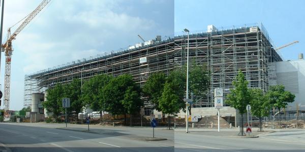 | Der Brunnen auf dem Vorplatz wird verlegt. | Die Halle ist schon teilweise verglast. | Die Halle ist schon teilweise verglast. | Die neue Seite der Halle. | |||