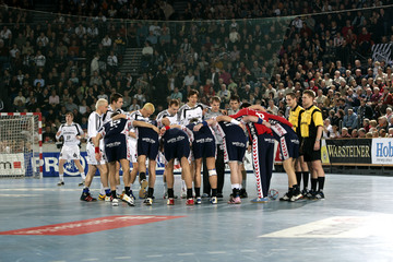 | Kapitän Stefan Lövgren während einer Auszeit. | Adrian Wagner greift sich nach einem Foul an den Hals. | Norwegische Freunde: Glenn Solberg, Frode Hagen und Johnny Jensen. | SG-Kapitän Sören Stryger am Ball. | |||