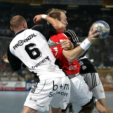 | Vid Kavticnik. | Viktor Szilagyi. | MT-Torhüter Mario Kelentric. | Petr Hruby wird von der THW-Deckung gestoppt. | |||