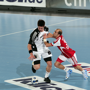 | Nikola Karabatic greift an. | Nikola Karabatic wird attackiert. | Anwurf. | Vor dem Anwurf. | |||