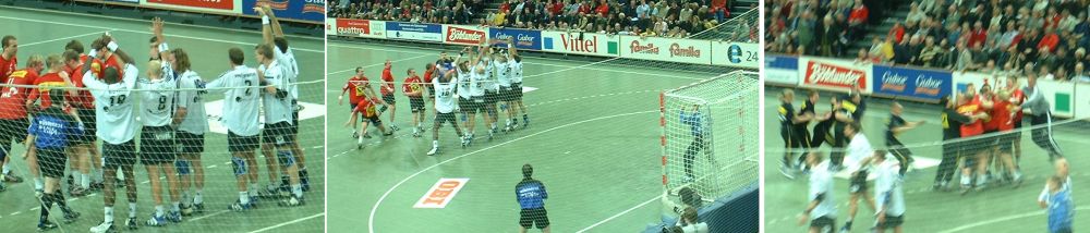 Wenn die Jungs im Block bleiben, geht kein Ball durch. Aber dies war kein Tor, was anerkannt werden muß. Drei Essener Spieler haben den Neun-Meter-Kreis betreten, bevor der Wurf erfolgte. Das ist kein regelgerechtes Tor, das muß abgepfiffen werden...