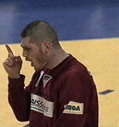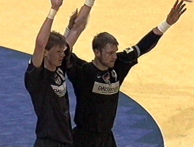 | Stefan Lövgren - Schwedens Kapitän. | Staffan Olsson erzwang die Verlängerung. | Henning Fritz - mit Irokesenfrisur. | Abwehrchef Klaus-Dieter Petersen mit Volker Zerbe (links). | |||