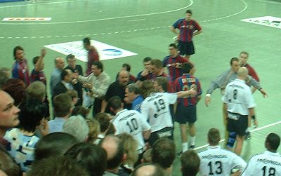 Wenn man mir vorher angeboten hätte, daß wir mit sieben Toren VOrsprung ins Rückspiel gehen, hätte ich gesagt "das ist ein Superergebnis". Aber jetzt ärgern wir uns doch ein bißchen, daß es nicht noch mehr geworden ist. Einige Würfe von mir waren schlecht. Du willst werfen. Dann steht ein Doppelblock vor dir. Also entweder in den Block oder vorbei, dorthin wo der Torwart steht. Am besten wäre weiter zu spielen, aber das ist dann nicht mehr ganz einfach.[Zur Phase, als Barcelona auf 20:23 herankam:]