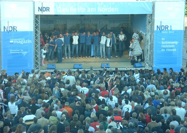 Doch eine Stunde später auf dem Ostsehallenvorplatz regierte dann noch einmal der Spaß und die Freude. Die Mannschaft, die diverse Gesangseinlagen darbot, wurde von den Fans gefeiert und revanchierte sich am Abend noch mit Freibier.