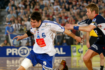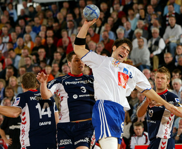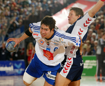 | Montpelliers Nikola Karabatic setzt sich gleich gegen drei Flensburger durch: Johnny Jensen, Kaupo Palmar und Sören Stryger. | Montpelliers Nikola Karabatic im Zweikampf mit Johnny Jensen. | Montpelliers Nikola Karabatic am Ball. Im Vordergrund Blazenko Lackovic. | Montpelliers Nikola Karabatic kann nicht von Sören Stryger gestoppt werden. | |||