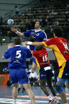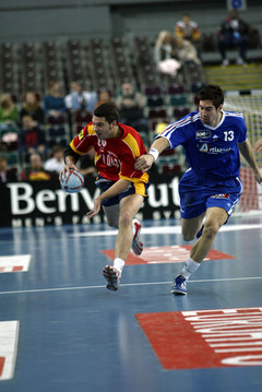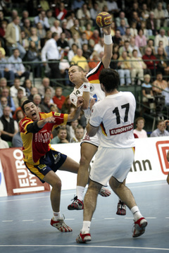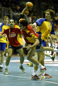 | QS-Supercup: Marcus Ahlm setzt sich gegen Demetrio Lozano durch. | QS-Supercup: Marcus Ahlm setzt sich durch. | QS-Supercup: Kim Andersson versucht die spanische Deckung zu überwinden. | QS-Supercup: Christian Zeitz. | |||