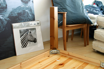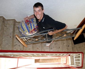 | Schon ein Zebra: THW-Neuzugang Dominik Klein hat ein Bild eines Zebras in seiner Wohnung stehen. | THW-Neuzugang Dominik Klein schleppt seine Möbel aus dem Möbelwagen in seine neue Wohnung, die er Ende Juni in Melsdorf vor den Toren Kiels bezogen hat. | THW-Neuzugang Dominik Klein (rechts) entlädt gemeinsam mit seinem Vater Theo den Möbelwagen. | THW-Neuzugang Dominik Klein kommt beim Schleppen seiner Möbel in seine neue Wohnung, die er Ende Juni in Melsdorf vor den Toren Kiels bezogen hat, ordentlich ins Schwitzen. | |||