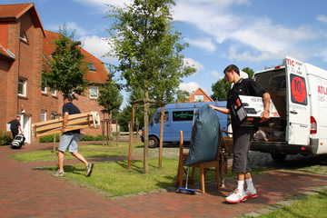 | THW-Neuzugang Dominik Klein (rechts) schleppt seine Möbel aus dem Möbelwagen in seine neue Wohnung, die er Ende Juni in Melsdorf vor den Toren Kiels bezogen hat. | THW-Neuzugang Dominik Klein schleppt seine Möbel durch das Treppenhaus in seine neue Wohnung, die er Ende Juni in Melsdorf vor den Toren Kiels bezogen hat. | |||||