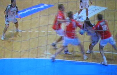 Allerdings ließen die Kieler vor der Pause mehrfach die Chance verstreichen, der Melsunger Turngemeinde vor den Augen von Hans Meyer (Trainer des Fußball-Bundesligisten 1. FC Nürnberg) den Zahn zu ziehen. Nikola Karabatic, der mit einem 40-Meter-Tor in den verwaisten Kasten für das Schmankerl des Tages sorgte, und Henrik Lundström setzten zwei Siebenmeter an die Latte, Linkshänder Kim Andersson fand gegen die rustikale 6:0-Abwehr zunächst nicht zu seinem Spiel. Und tauchten die "Zebras" frei am Kreis auf, war zumeist der starke Kroate Mario Kelentric im MT-Tor Endstation. Der Lärmpegel in der Betonhülle, die für 50 000 Euro innerhalb von zwei Tagen in einen Resonanzkörper mit Parkett verwandelt worden war, ließ erstmals in der 20. Minute Gespräche mit Nachbarn zu. Dank der Paraden des überragenden Thierry Omeyer hatten die Kieler sich mit 13:9 abgesetzt, doch die Rot-Weißen gaben nicht auf. Sie hatten in Lemgo gewonnen, zu Hause die "Löwen" besiegt - warum also nicht auch den Meister stürzen?
