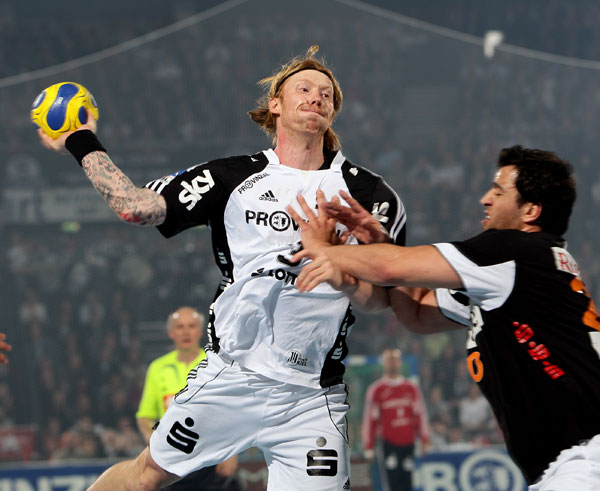 Doch zunächst schien es noch so, als wenn der Feuerwerks-Rauch aus dem Einlauf unten auf dem Parkett noch nicht ganz verschwunden war, denn beide Teams hatten erst einmal Probleme, das Tor zu treffen: Der nach seinem Schleudertrauma wiedergenesene Filip Jicha verzog genauso wie Christian Zeitz und Stefan Lövgren vom Siebenmeterpunkt, Marcus Ahlm stand bei seinem Nachwurf nach einer Weber-Parade bereits im Kreis. Die Gäste aus Wetzlar, bereits in der letzten Saison Zeuge einer Meisterfeier in der Sparkassen-Arena, machten es zunächst auch nicht besser, ihnen gelang in der vierten Minute durch Routinier Alois Mraz aber dann doch die Führung, welche Jicha postwendend beantwortete. Kevin Schmidt mit einem feinen Siebenmeter-Heber schaffte noch eine zweite Führung für die Hessen, doch dann drehten die Zebras erstmals auf: Zweimal Jicha und einmal Lövgren besorgten das 4:2 für den THW.
