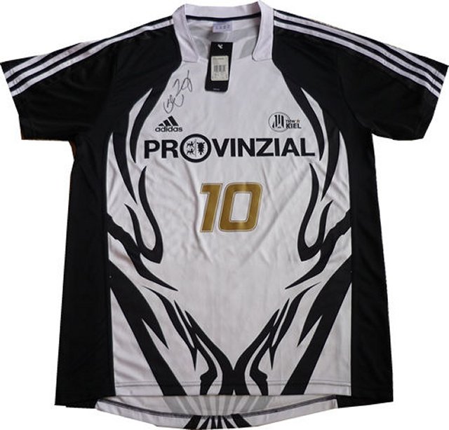 Das schwarz-weiße Shirt der Firma Adidas hat an den schwarzen Ärmeln jeweils die drei weißen Streifen. Auf der Vorderseite befinden sich das Adidas-Logo, der Provinzial-Schriftzug, das Abzeichen des THW Kiel sowie die goldene Nummer 10. Das vorne beginnende Zebra-Muster setzt sich auf der kompletten Rückseite fort. Hier befindet sich des weiteren die goldene 10 sowie oberhalb dieser Nummer der goldene Schriftzug "Danke Stefan".