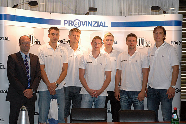 Lang war die Tafel, an der die zahlreichen Neuzugänge, die THW-Geschäftsführer Uli Derad und Sabine Holdorf-Schust, Pressesprecher Björn Goos und die Ausichtsratsmitglieder Platz genommen hatten. Erstmals war auch Marcus Ahlm in seiner neuen Funktion als Kapitän mit von der Partie. Nach den Begrüßungsworten von Provinzial-Vertriebsvorstand Matthew Wilby, der den im Urlaub weilenden Ulrich Rüther vertrat, gab Ahlm sein Statement zur neuen Saison ab. "Die Neuzugänge passen sehr gut zu unserer Truppe", sagte der Kapitän. "Wir haben viel trainiert, werden das Augenmerk in den nächsten Tagen vermehrt auf taktische Elemente legen. Wir wollen uns als Mannschaft weiter entwickeln, denn nur dadurch kommt der Erfolg." Mit seiner neuen Rolle, so Ahlm, habe er sich indes intensiv auseinandergesetzt. "Ich habe jetzt mehr Verantwortung, ich freue mich darauf. Ich spiele seit sechs Jahren in Kiel, kenne das Umfeld und den Verein. Nun hoffe ich, dass auch die Spieler mit mir zufrieden sind."