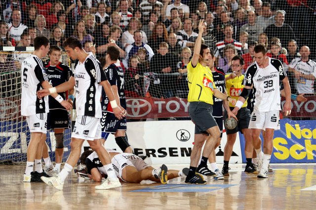 Mit 7:4 führten die Gäste in der 13. Minute. Sicher in der Deckung, im Angriff mit Zug zum Tor - souverän. Die Hausherren konnten sich bei ihrem wendigen Kreisläufer Michael Knudsen bedanken, der die Seinen im Alleingang im Spiel hielt. Doch die Kieler verloren mit zunehmender Spieldauer ihren Schwung, verzettelten sich in der leidenschaftlich kämpfenden SG-Deckung und spätestens in der 26. Minute zeigte auch die "Hölle Nord" ihr altes Gesicht. So tobten die "Ultras" auf der Stehtribüne, als ein Wurf von Christian Zeitz seine Flugbahn auf der Nase von Thomas Mogensen beendete. Der Däne sank zu Boden, Erinnerungen an den April 2007 wurden wach, als Zeitz hier Torwart-Ikone Jan Holpert hart im Gesicht getroffen hatte. Eine Szene, die damals Tumulte auslöste, diesmal eine, die den SG-Fans ihr Selbstbewusstsein zurück gab. Es war ihre Halle, egal wie viele Kieler an die dänische Grenze gepilgert waren.