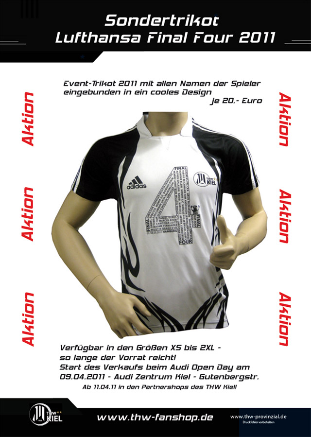 Das Event-Trikot kostet 20,00 Euro und ist in den Größen XS bis XXL verfügbar - solange der Vorrat reicht. Der Verkauf startet exklusiv beim "Audi Open Day" am Samstag, den 9. April beim Audi Zentrum Kiel (Gutenbergstraße 84-86). Ab Montag, den 11. April ist das Event-Trikot dann auch im Online-Fanshop unter www.thw-fanshop.de sowie in allen offiziellen THW-Fanshops erhältlich. Eine Liste aller Geschäfte finden Sie hier.