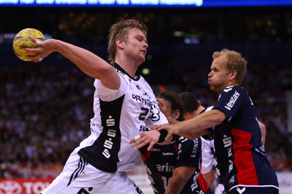 Ohne Rücksicht auf Größenunterschiede sprangen sich der zierliche Henrik Lundström und der bullige Daniel Kubes in die Arme, Filip Jicha spielte Brummkreisel mit seinem Freund Daniel Narcisse und für Christian Zeitz hagelte es Küsse. Kapitän Marcus Ahlm drückte dem überragenden Linkshänder einen Schmatzer auf die Wange, Kumpel Christian Sprenger wählte dafür die Stirn des 30-Jährigen, der zurecht zum besten Spieler des Pokalwochenendes gewählt worden war. Der beste Torschütze war er auch. Fünfmal hatte er im Halbfinale tags zuvor gegen Göppingen (28:23) getroffen, sechsmal im Endspiel, in dem er neben Thierry Omeyer, Dominik Klein, Filip Jicha und Aron Palmarsson zu den herausragenden Kräften einer starken Kieler Mannschaft zählte.