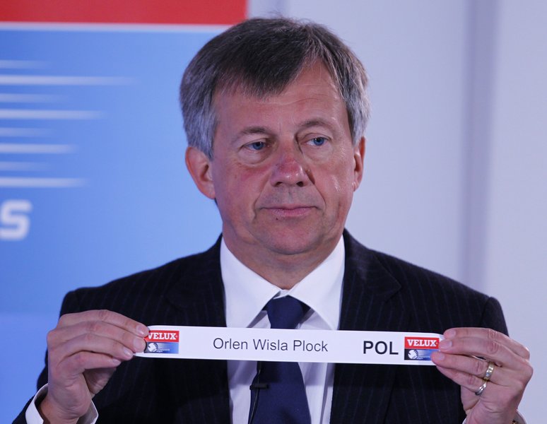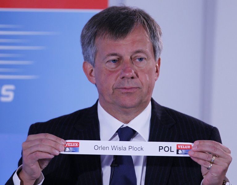 EHF-Generalsekretär Michael Wiederer präsentiert das  Los "Orlen Wisla Plock".