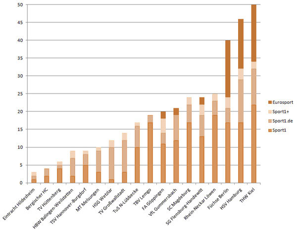 Der Bergische HC, Eintracht Hildesheim, HSG Wetzlar, HBW Balingen-Weilstetten, MT Melsungen, TV Großwallstadt, TV Hüttenberg und die TSV Hannover-Burgdorf kommen mit 31 in der Addition, Sport1+ inbegriffen, auf weniger TV-Zeiten als der HSV Hamburg alleine. Dieser Wert alleine macht durchaus einen qualitativen Unterschied innerhalb der Liga deutlich, zumal Burgdorf, Hüttenberg und Großwallstadt allein 16 TV-Zeiten auf sich vereinigen. Günstig für den TV Großwallstadt ist dabei zudem, dass der Bayerische Rundfunk den Klub aus Mainfranken mindestens achtmal in der TV-Nachverwertung der Sportsendungen berücksichtigte. Der SC Magdeburg kommt im MDR allerdings auf 16 Nachberichte, der Rundfunk Berlin-Brandenburg beleuchtete die Füchse Berlin 21 Mal.