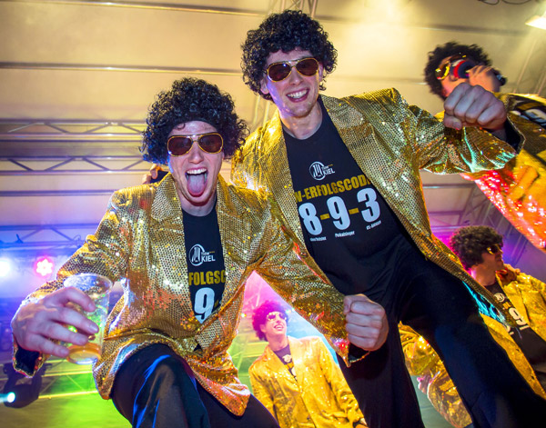 Fast schon ungläubig standen die "Neu-Kieler" inmitten des Geschehens. Rene Toft Hansen kramte immer wieder sein Smartphone hervor, um die Stimmung im digitalen Gedächtnis zu speichern. Gudjon Valur Sigurdsson schwankte zwischen Überschwang mit Teamkollegen und Betreuern und familiären Momenten, in denen er seinen Kindern das Geschehen erklärte. Und bei Patrick Wiencek hielt das Outfit den Anforderungen nur kurz stand. Mit geplatzter Hose präsentierte er sich im feinsten Patrioten-Look: schwarze Schlaghose, goldenes Jacket und rote Unterbüx.