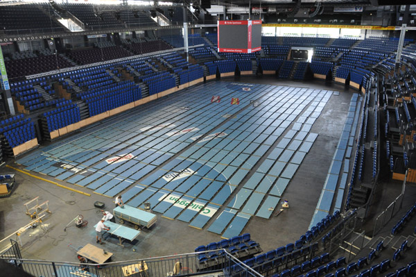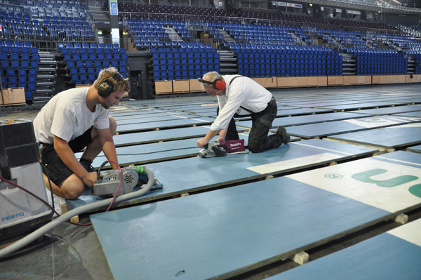 Klicken Sie zum Vergrößern! Spätestens zum Abschiedsspiel für Marcus Ahlm soll der Hallenboden wieder in neuem Glanz erstrahlen.