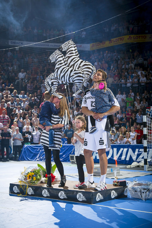 Nach dem Spaß kam, wie immer bei Abschiedsfeiern großer THW-Spieler, die Wehmut. Als Ahlm mit seiner Familie im Dunkel stand, auf dem Würfel eine Bildergalerie seiner Erfolge ablief, wurde endgültig klar, dass er tatsächlich aufgehört hatte. Spätestens um 21.38 Uhr herrschte Gewissheit, als an der Hallendecke die Leinwand mit seinem Konterfei enthüllt wurde. Und seiner Nummer, der "13".