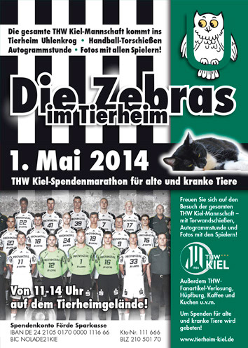 Wie wichtig dem THW die Unterstützung des Tierheims ist, zeigt sich auch daran, dass die Mannschaft erstmals komplett zum Uhlenkrog kommt. Eine Stunde lang signieren die "Zebras" Autogrammkarten und Fanartikel. Darüber hinaus erwartet die Besucher eine Fotoaktion, ein sportliches Mitmachangebot, eine Tombola sowie weitere Überraschungen. Kinder können sich auf einer Hüpfburg austoben, ein Küchenbüfett lädt zum Stärken ein.