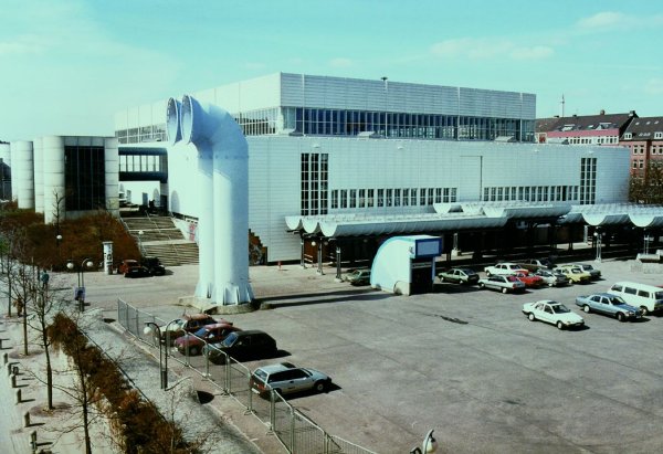 | Aus Osten: Die gläserne Vorderseite. | Die Ostseehalle im Umbau - Blick von Osten. | Der östliche Aufgang zur Halle. In der Glaspartie reflektiert sich der Rathausturm. | Die neue Halle im Schnitt. | |||