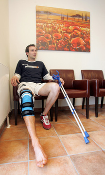 | THW-Mannschaftsarzt Dr. Frank Pries erklärt Viktor Szilagyi, der auf einer Behandlungsliege liegt, anhand eines Modells die Verletzung im Knie. | THW-Mannschaftsarzt Dr. Frank Pries untersucht Viktor Szilagyi nach seiner Operation am Knie zur Kontrolle. | THW-Mannschaftsarzt Dr. Frank Pries erklärt Viktor Szilagyi, der auf einer Behandlungsliege liegt, anhand eines Modells die Verletzung im Knie. | Warten und Geduld ist jetzt angesagt: Viktor Szilagyi sitzt vor seinem Arzt-Besuch im Wartezimmer des Mare Klinikum in Kronshagen. | |||