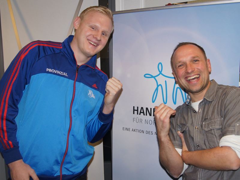 | Warm machen. | Jubel nach dem Sieg. | Patrick Wiencek im Studio der "NDR 1 Welle Nord" mit Moderator Jan Bastick. | Patrick Wiencek. | |||