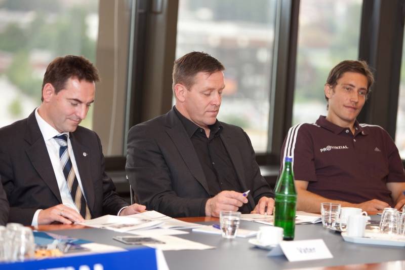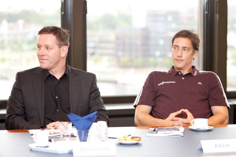 | Saisoneröffnungspressekonferenz 2010: THW-Trainer Alfred Gislason. | Saisoneröffnungspressekonferenz 2010. | Saisoneröffnungspressekonferenz 2010: Alfred Gislason und Marcus Ahlm. | Saisoneröffnungspressekonferenz 2010: Milutin Dragicevic, Alfred Gislason und Daniel Kubes. | |||