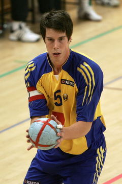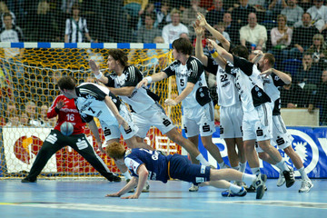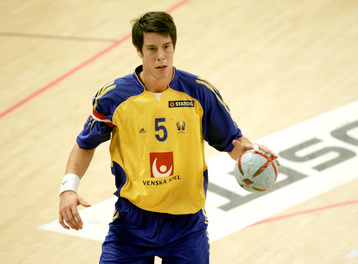 | Stefan Kneer beim direkten Freiwurf. | Stefan Kneer beim direkten Freiwurf. | Kim Andersson. | Kim Andersson wird attackiert. | |||
