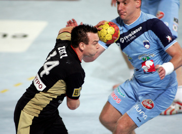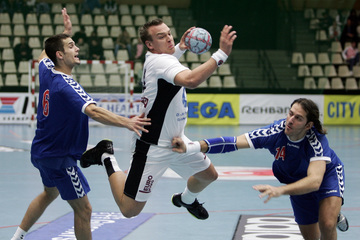 Christian Zeitz kommt zu spät, Glenn Solberg ist durch. Christian Zeitz gegen Christian Berge. Lars Krogh Jeppesen und Christian Zeitz kämpfen um den Ball. EM 2006: GER - SLO: Christian Zeitz.