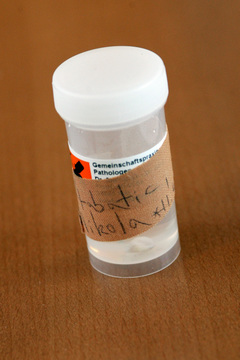 | Dr. Frank Pries untersucht Nikola Karabatic. | Dr. Frank Pries untersucht Nikola Karabatic. | Die entfernten freien Gelenkkörperchen. | Nikola Karabatic. | |||