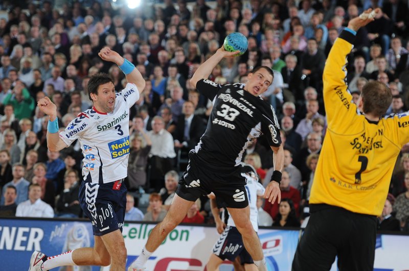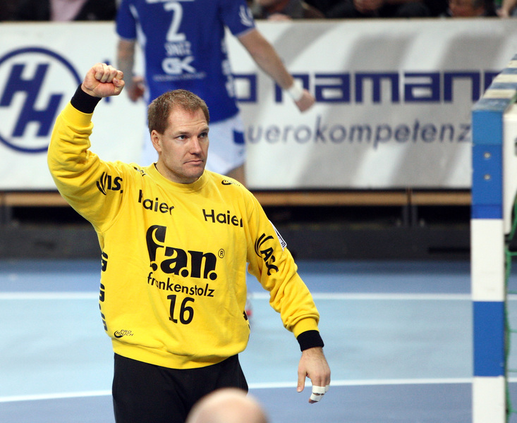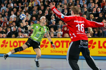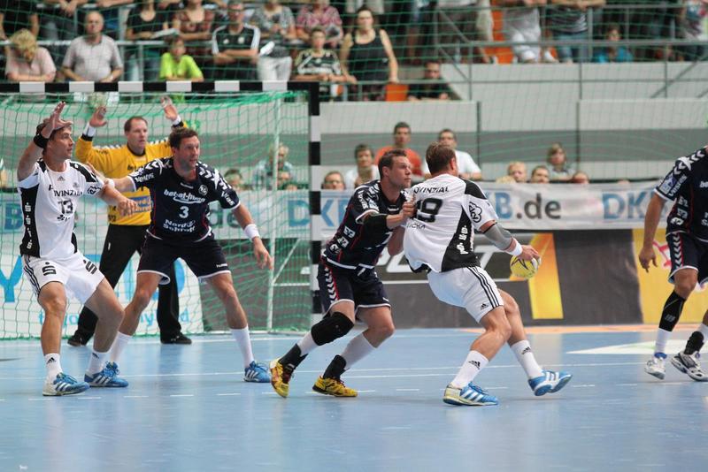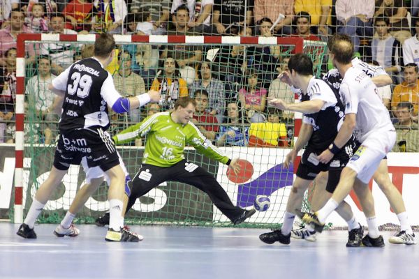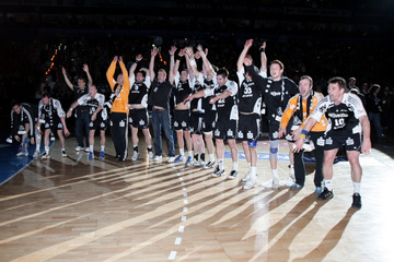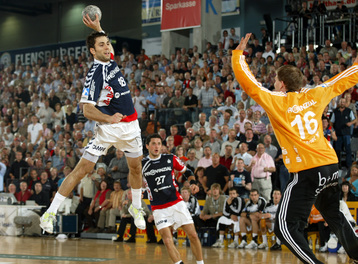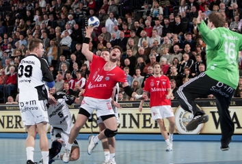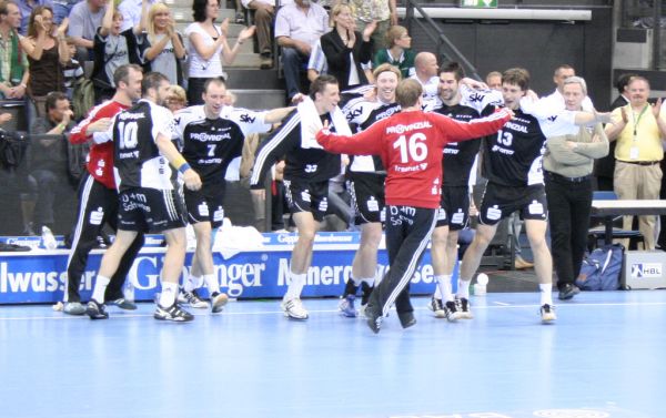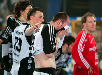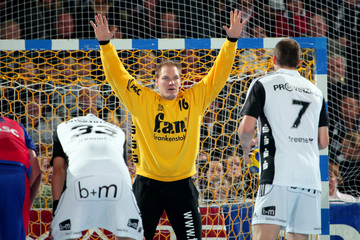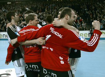 | Tobias Karlsson, Dominik Klein und Mattias Andersson. | Mattias Andersson. | Jubel beim TVG. | Momir Ilic gegen Mattias Andersson. | |||