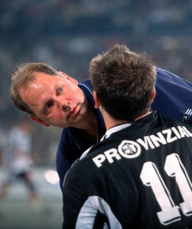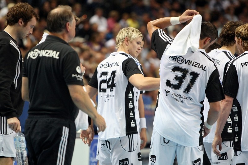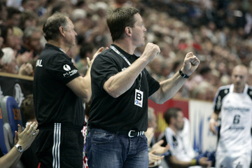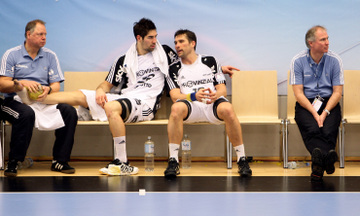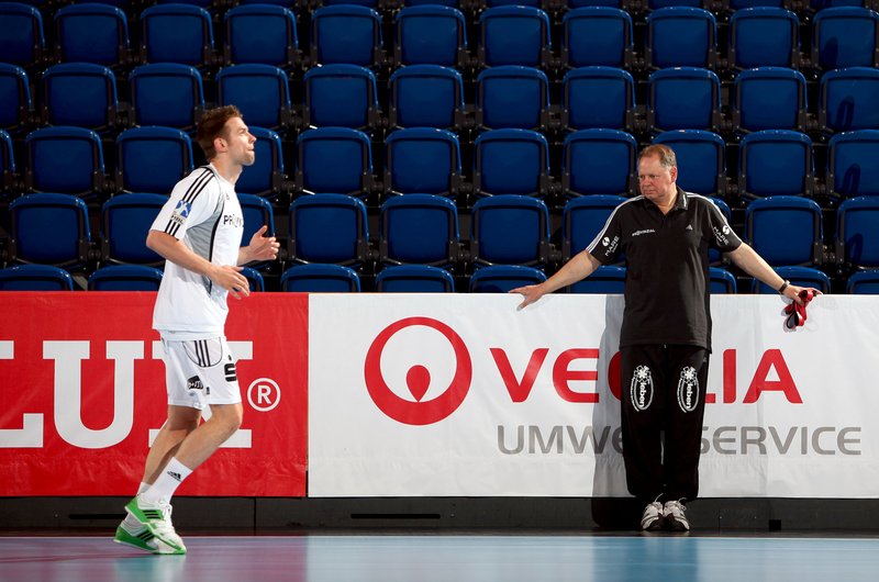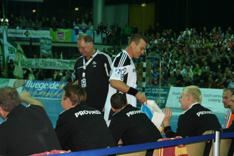| Andersson und Brandenburg machen Dehnübungen. | Deutscher Meister! | Adrian Wagner liegt verletzt am Boden, Physiotherapeut Uwe Brandenburg (mitte) und Mannschaftsarzt Dr. Detlev Brandecker (rechts) kümmern sich um den Linksaußen. | Uwe Brandenburg kümmert sich um Viktor Szilagyi. | |||
