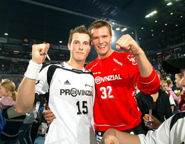 | Meisterfeier auf dem Kieler Rathausplatz. | Meisterfeier auf dem Kieler Rathausplatz: Youngster Christoph Schindler springt Christian Zeitz in die Arme. | Meisterfeier auf dem Kieler Rathausplatz und müde Helden. Von links Marcus Ahlm, Christoph Schindler und Stefan Lövgren. | Christoph Schindler in seinem ersten Europapokalspiel. | |||