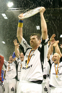 | Trainingslager 2005: Der Name ist Programm: Christoph Schindler schindet sich beim Krafttraining. | Porträt 2005/2006: Christoph Schindler. | Forstbaumschule 2005: Christoph Schindler,Henning Fritz und Frau Babett. | Geschafft! THW-Kapitän Stefan Lövgren reckt die Meisterschale nach dem Spiel in Düsseldorf in die Höhe. Die Mannschaft jubelt. | |||