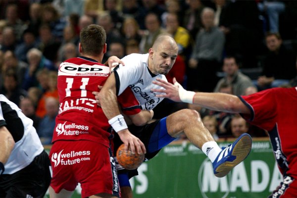 | Senianin Maglajlija setzt sich gegen Dominikovic und Bjerre durch. | Die THW-Deckung packt zu. | Davor Dominikovic. | Davor Dominikovic. | |||