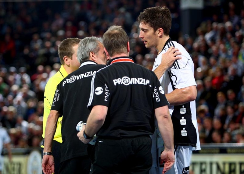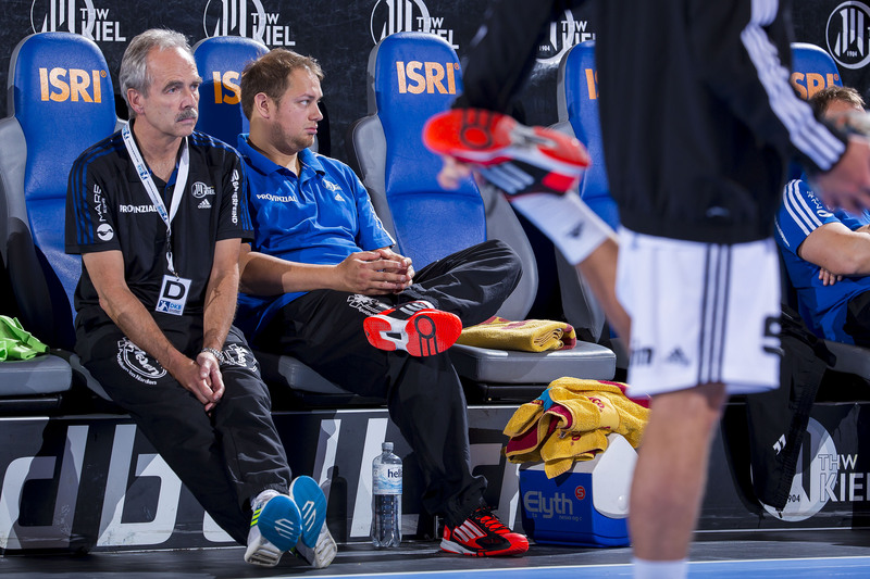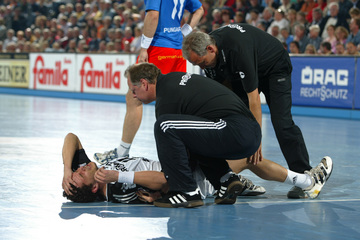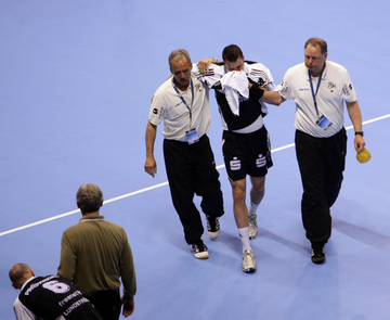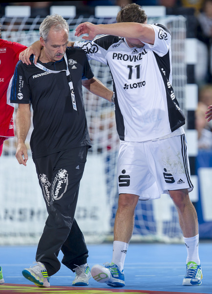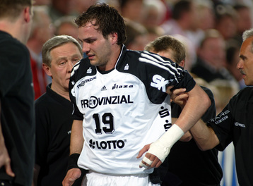 | THW-Spielmacher Viktor Szilagyi wird verletzt vom Platz geführt, links Physiotherapeut Dennis Missling und rechts Mannschaftsarzt Dr. Detlev Brandecker. | Viktor Szilagyi verlässt die Ostseehalle verletzt. | Adrian Wagner liegt verletzt am Boden, Physiotherapeut Uwe Brandenburg (mitte) und Mannschaftsarzt Dr. Detlev Brandecker (rechts) kümmern sich um den Linksaußen. | Schrecksekunde für den THW: Kapitän Stefan Lövgren wird von Physiotherapeut Uwe Brandenburg und Mannschaftsarzt Dr. Detlev Brandecker vom Platz geführt. | |||