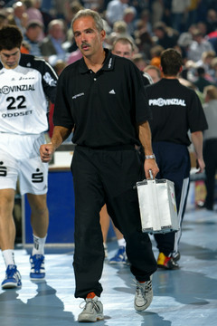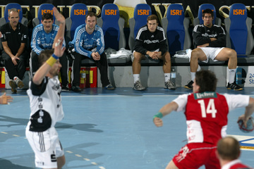 | Mannschaftsarzt Dr. Detlev Brandecker bei der Arbeit. Im Hintergrund ist Nikola Karabatic zu sehen. | Pittis Abschied: Die med. Abt. mit Dr. Brandecker, Brandenburg, Rother und Mommsen singt ein Ständchen. | Pittis Abschied: Die med. Abt. mit Dr. Brandecker, Brandenburg, Rother und Mommsen singt ein Ständchen. | Schrecksekunde: Die chronische Adduktorenzerrung macht sich bei "Löwe" wieder bemerkbar. | |||