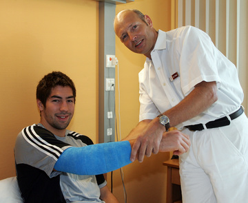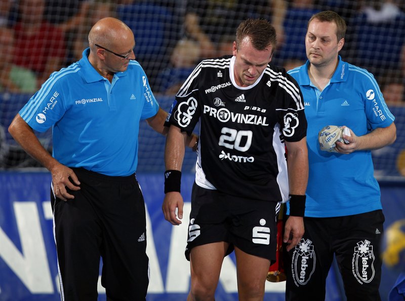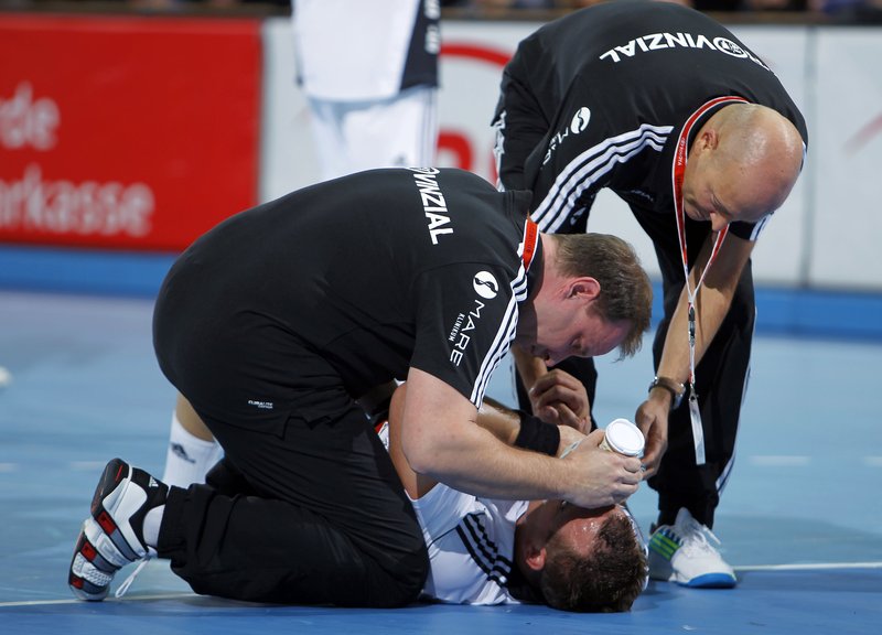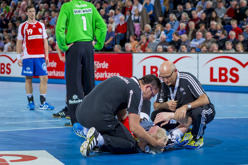 | Die Ärzte Dr. Frank Pries und Dr. Detlev Brandecker. | Dr. Frank Pries untersucht Nikola Karabatic. | Dr. Frank Pries untersucht Nikola Karabatic. | Dr. Frank Pries untersucht Nikola Karabatic. | |||