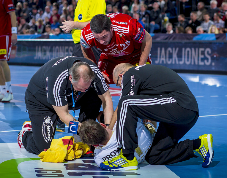 | Dr. Frank Pries untersucht Nikola Karabatic. | THW-Mannschaftsarzt Dr. Frank Pries erklärt Viktor Szilagyi, der auf einer Behandlungsliege liegt, anhand eines Modells die Verletzung im Knie. | THW-Mannschaftsarzt Dr. Frank Pries erklärt Viktor Szilagyi, der auf einer Behandlungsliege liegt, anhand eines Modells die Verletzung im Knie. | THW-Mannschaftsarzt Dr. Frank Pries untersucht Viktor Szilagyi nach seiner Operation am Knie zur Kontrolle. | |||