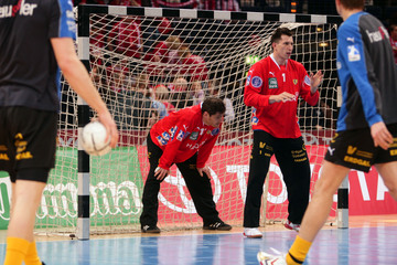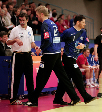 | Aufregung. | Spielszene. | Oliver Roggisch und Henning Fritz. | Dominik Klein gegen Henning Fritz. | |||