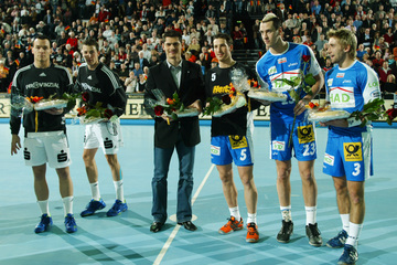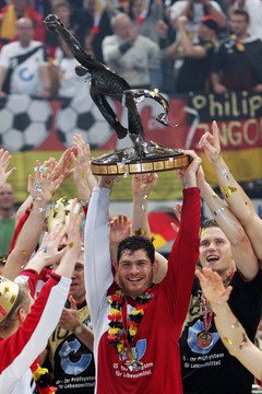 | Der neue DHB-Pokal. | Der neue DHB-Pokal. | Abschied von Stefan Lövgren: Die Weltauswahl. | Henning Fritz und Wolfgang Schwenke. | |||
