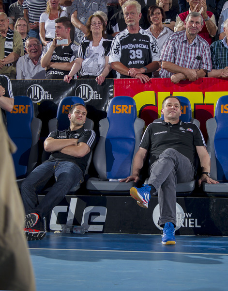 | Zuschauer beim ersten Halbfinale. | Spielszene. | Die Kieler Bank. | Michael Roth und Alfred Gislason. | |||