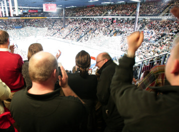 | Die riesige Arena. | Immer wieder toll: Die Zebras laufen ein. | Einlauf in die neue Halle. Große Version. | Die Fans vor der neuen Halle. | |||