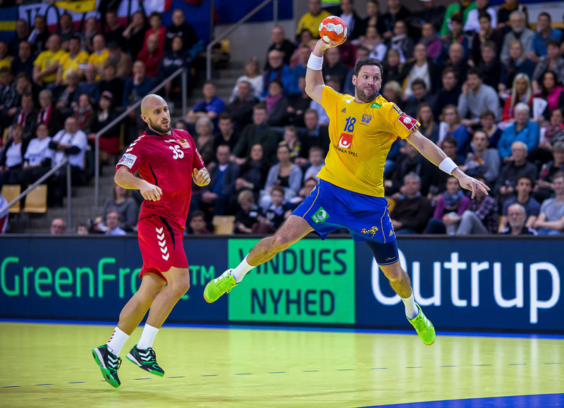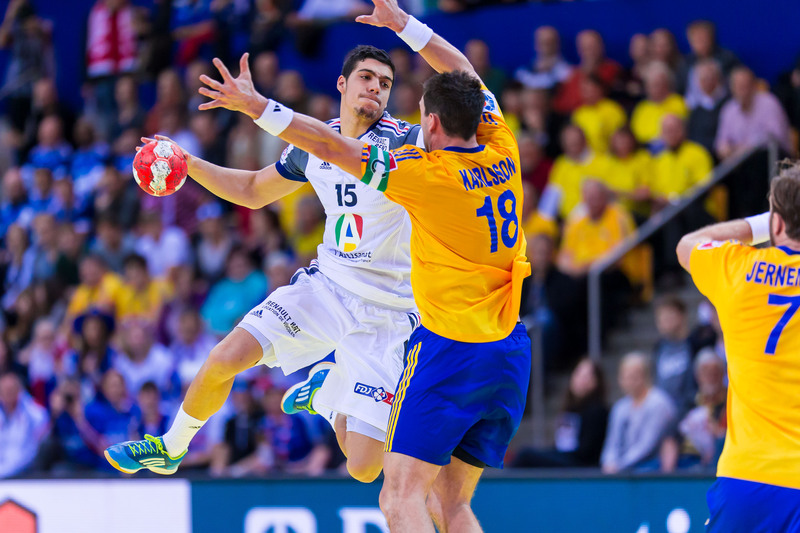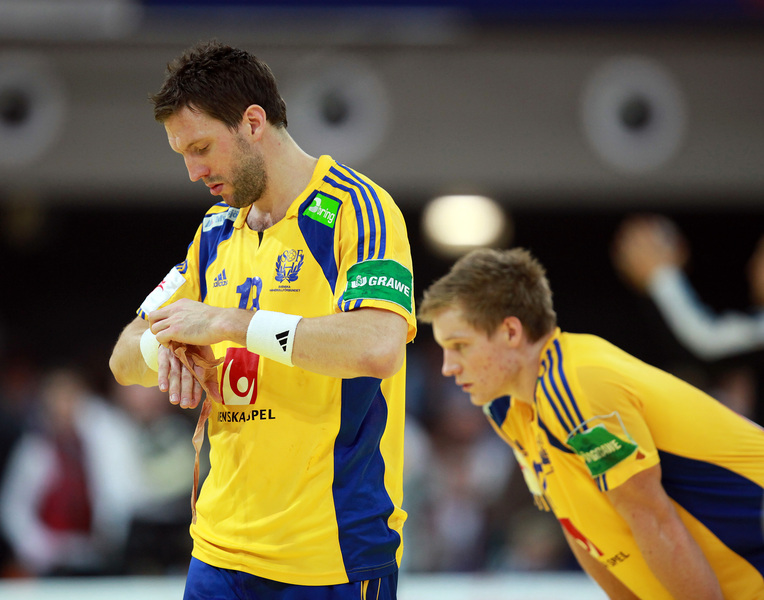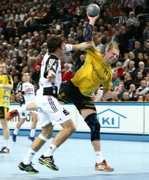 | Tobias Karlsson und Marcus Ahlm. | Spielszene. | Kampf um den Ball. | Aron Palmarsson gegen Tobias Karlsson. | |||