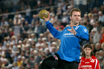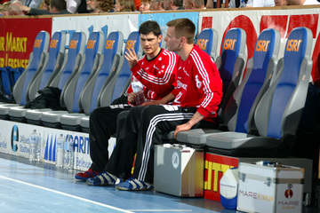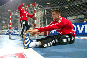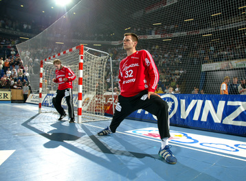 | Kiels dritter Torwart Dennis Klockmann dehnt sich während der Halbzeitpause. | Kiels dritter Torwart Dennis Klockmann dehnt sich während der Halbzeitpause. | Tipps vom Welthandballer des Jahres 2004: Henning Fritz nutzt die Halbzeitpause, um sich mit seinem Ersatz-Torwart Dennis Klockmann zu unterhalten. | Dennis Klockmann schreibt Autogramme. | |||
