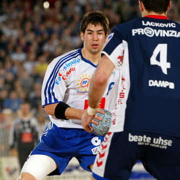 | 2. Halbfinale: Flensburg gegen Nordhorn: Flensburgs Blazenko Lackovic wird von Holger Glandorf gestoppt. Rechts klammert Iwan Ursic Flensburgs Kreisläufer Johnny Jensen. | 2. Halbfinale: Flensburger Jubel nach dem Schlussspfiff. Von links: Lars Christiansen, Andrej Klimovets, Blazenko Lackovic, Joachim Boldsen und Dan Beutler. | Montpelliers Nikola Karabatic am Ball. Im Vordergrund Blazenko Lackovic. | Blazenko Lackovic. | |||