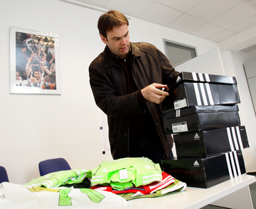 | Bruno Martini vor der THW-Geschäftsstelle. | THW-Geschäftsstellenleiterin Sabine Holdorf-Schust empfängt Bruno Martini. | Ein neues Trikotset für Bruno Martini. | Der richtige Schuh muss auch ausgewählt werden. | |||